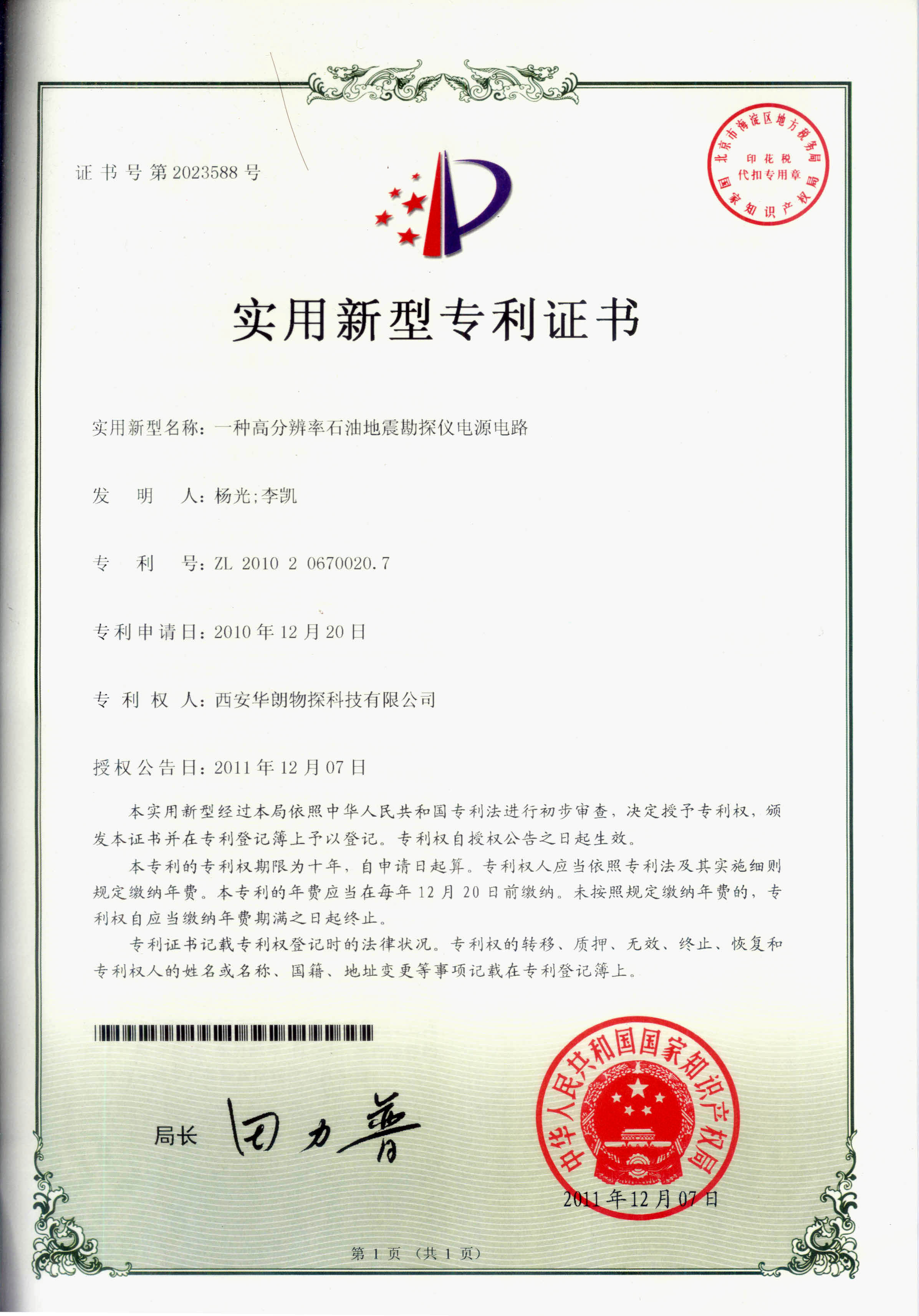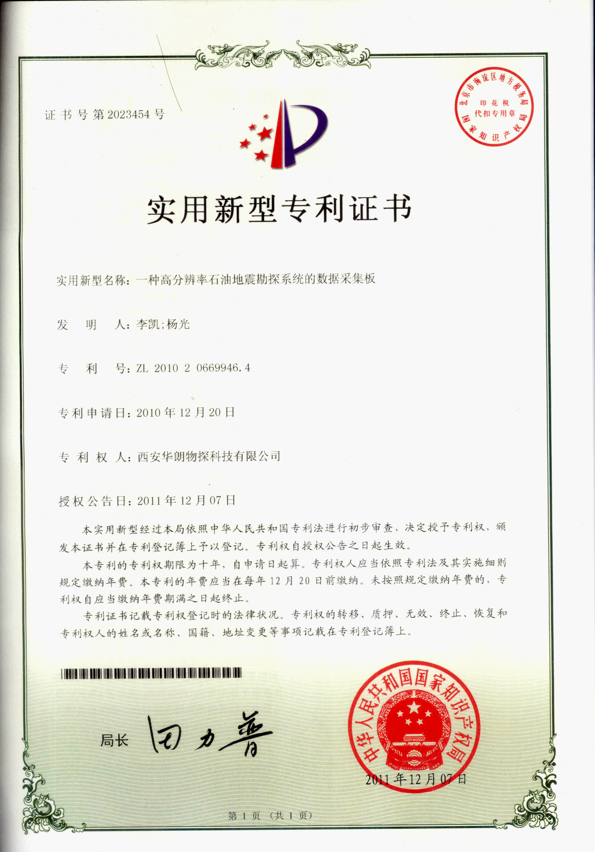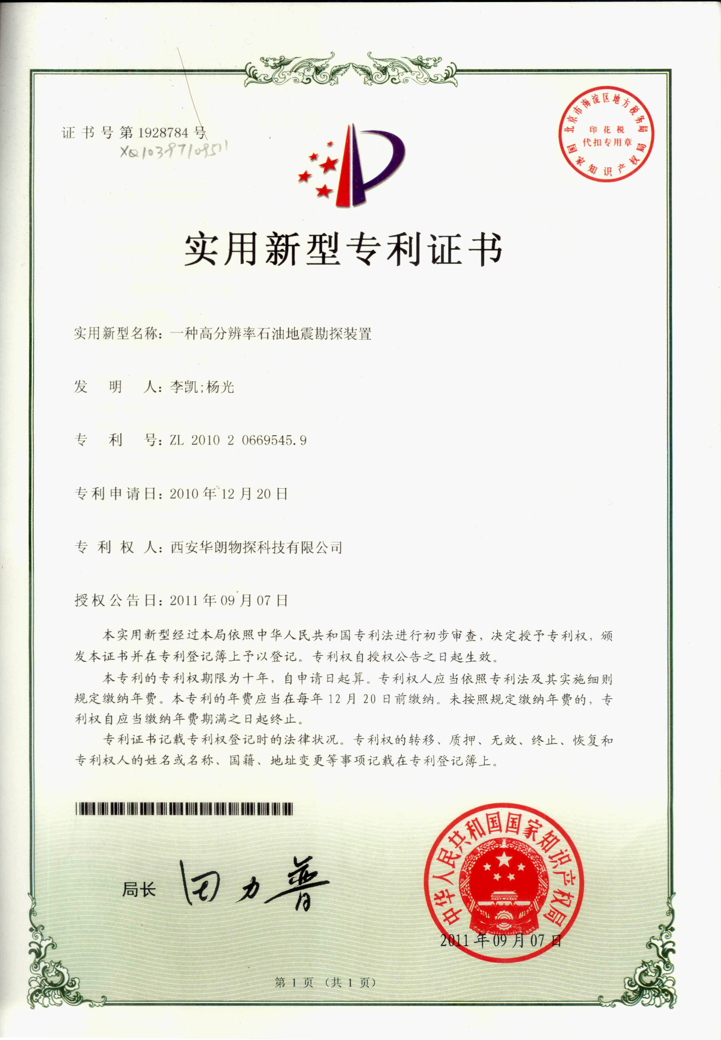 专利证书-技术资质-技术资质-HL48高精度地震仪,GCK24道工程勘测仪,HLB-01通用爆炸机,西安华朗物探科技有限公司