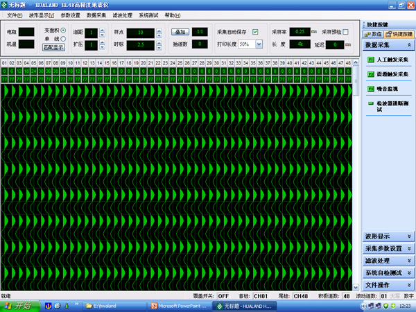 采用高性能24位A/D转换器,最高采样间隔20us, 国际先进水平。 采集通道1-48选择设置。 各道独立配置多档位前置放大器,各道增益独立设置,更好保证远、近端信号采集。 基于WinXP的嵌入式微机系统,人性化界面设计,轻松完成数据采集、处理、存储。 超高亮度彩色LED显示屏,在强光照射下仍可清晰显示波形。 标准工业级三防键盘、工业级三防遥感鼠标,易于使用、操作。